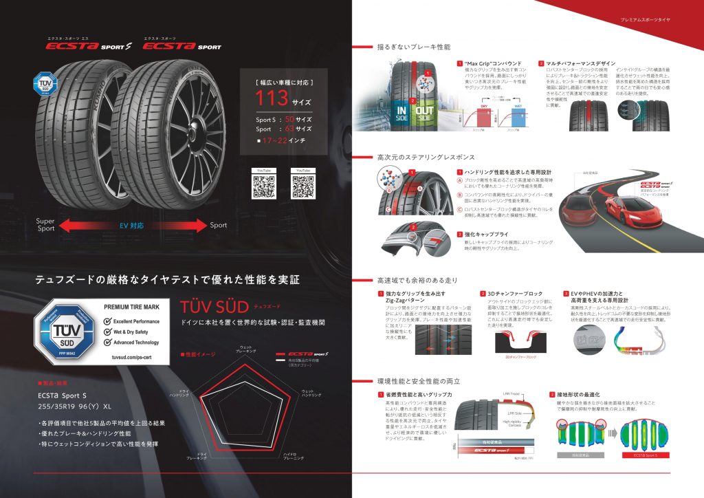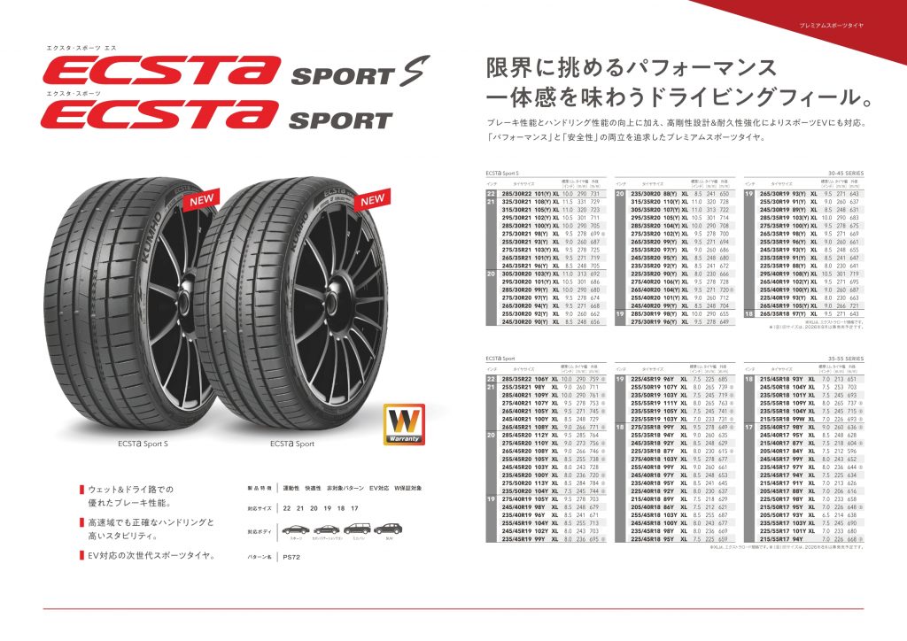 クムホタイヤジャパン株式会社は、EV対応のプレミアムスポーツタイヤ「ECSTA SPORT S(エクスタ スポーツ エス)」と「ECSTA SPORT(エクスタ スポーツ)」の発売を開始しました。